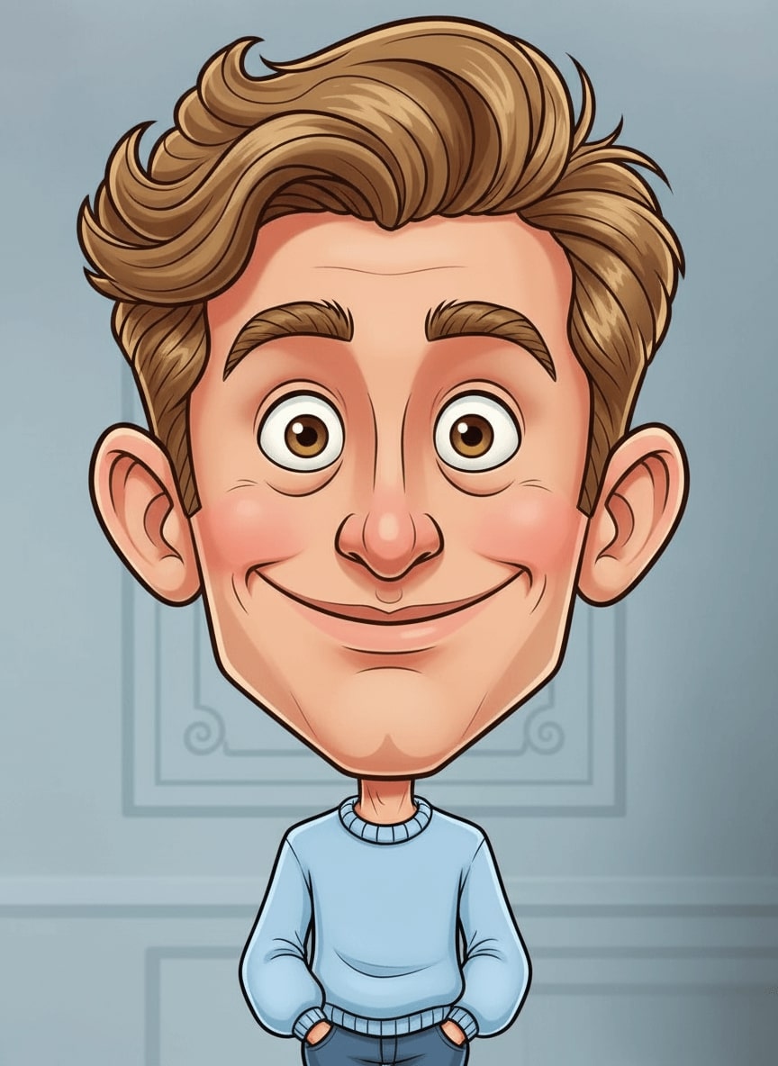 Turn the uploaded portrait into an extreme caricature, big head, petite body, exaggerated features, cartoon style, vibrant colors.