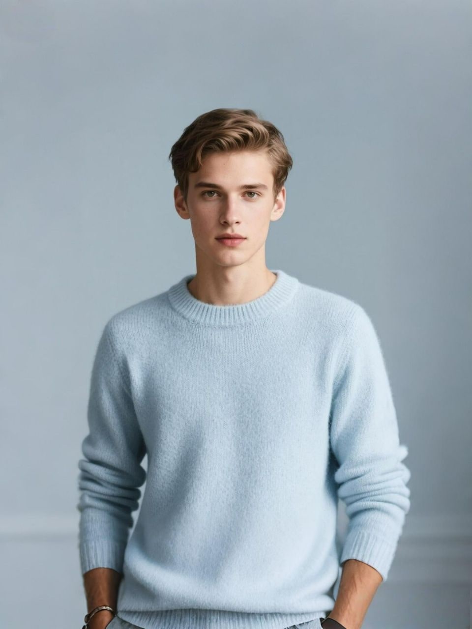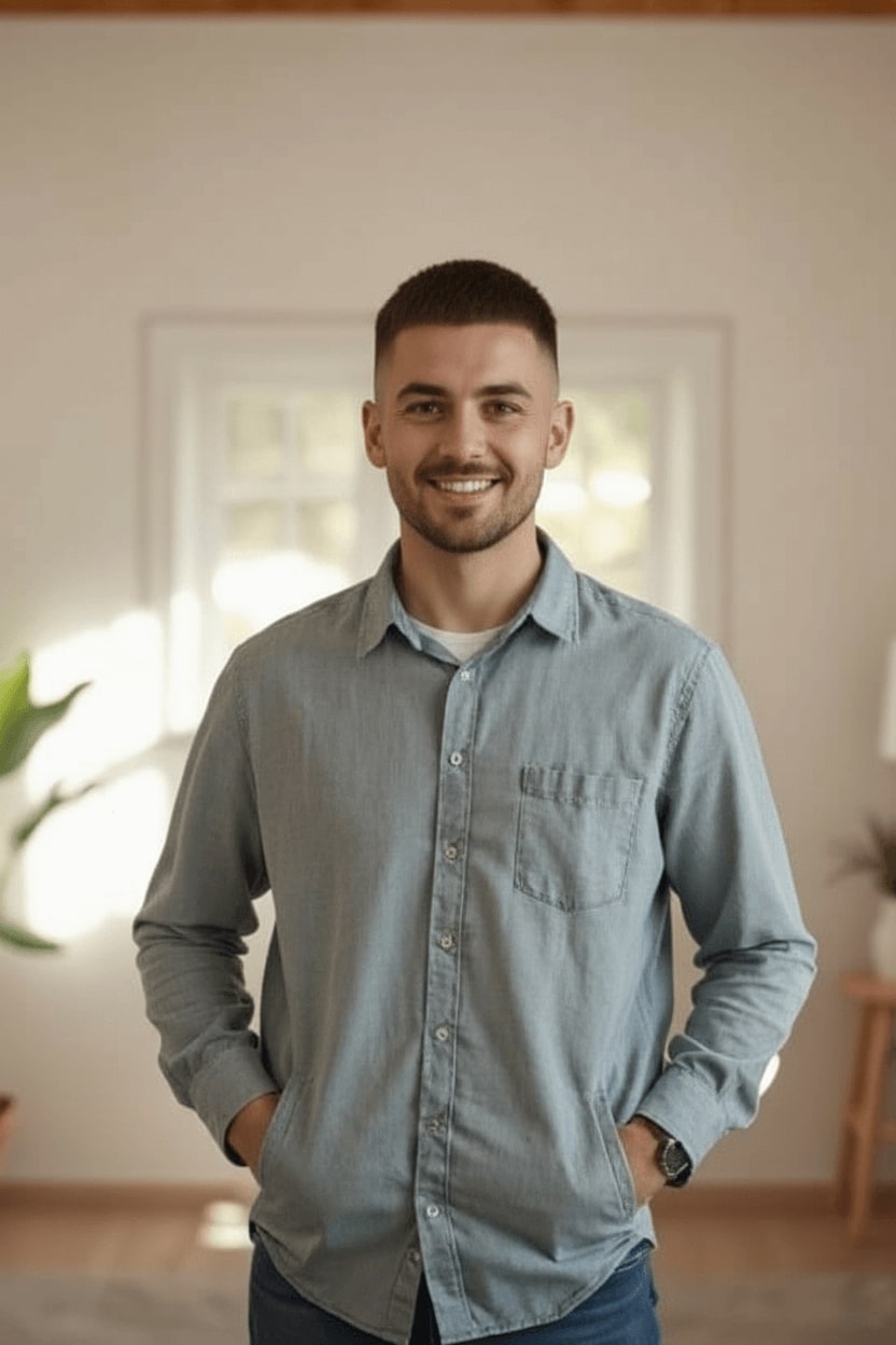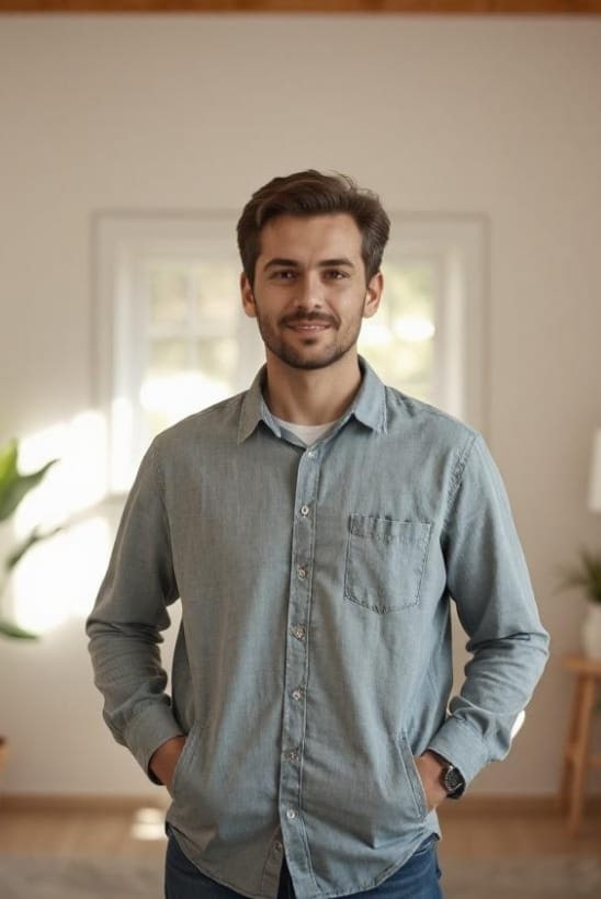 Convert the uploaded person into a moderately plump version: softer, rounder cheeks, a visible double chin, broader jawline, fuller arms, waist, and thighs, with subtle belly rolls. Clearly chubbier yet still easily recognizable, with noticeably altered but balanced proportions.